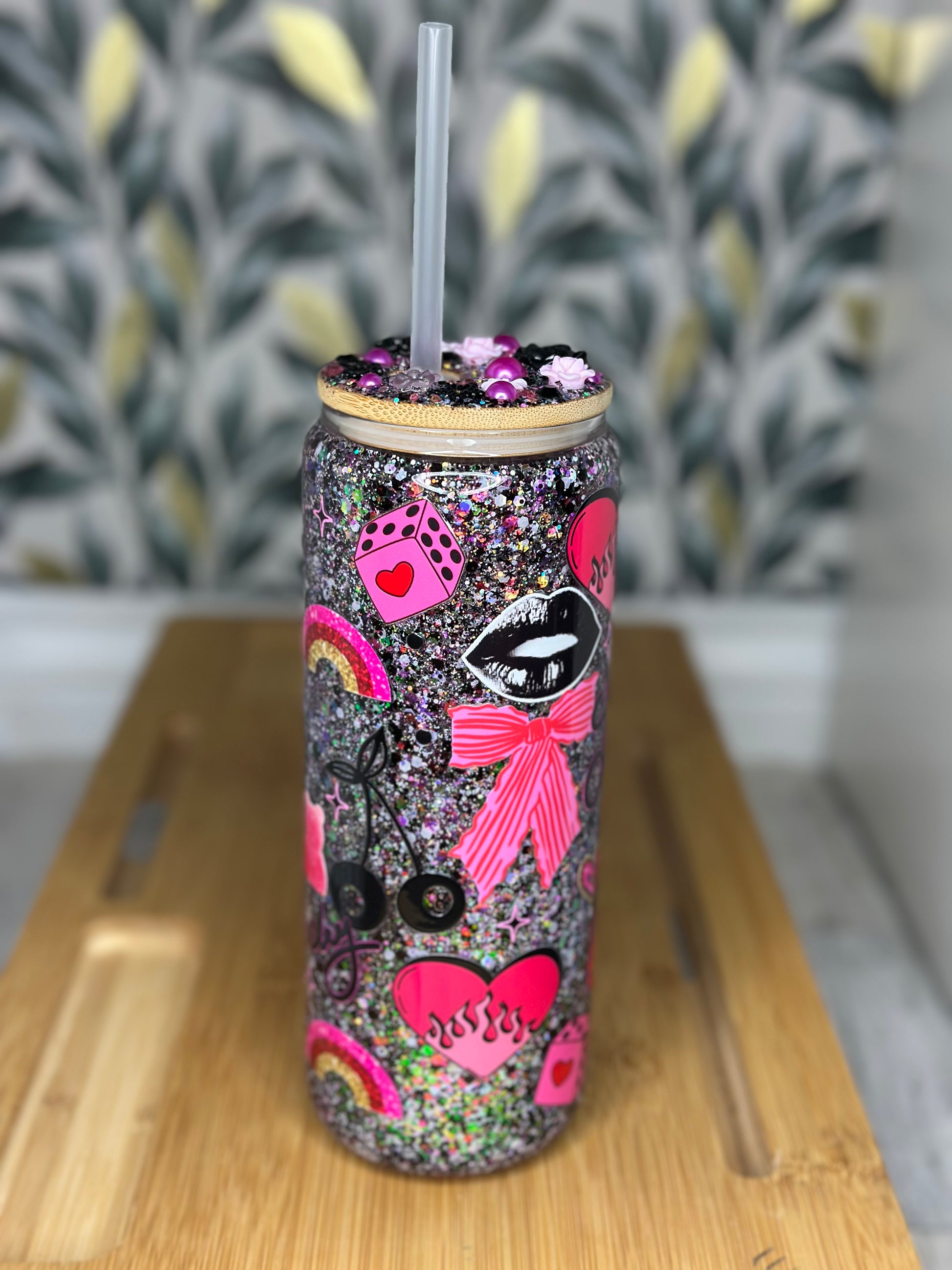 This listing is for ONE 20oz Glass snowglobe cup with bamboo lid, plastic straw & cup charm.