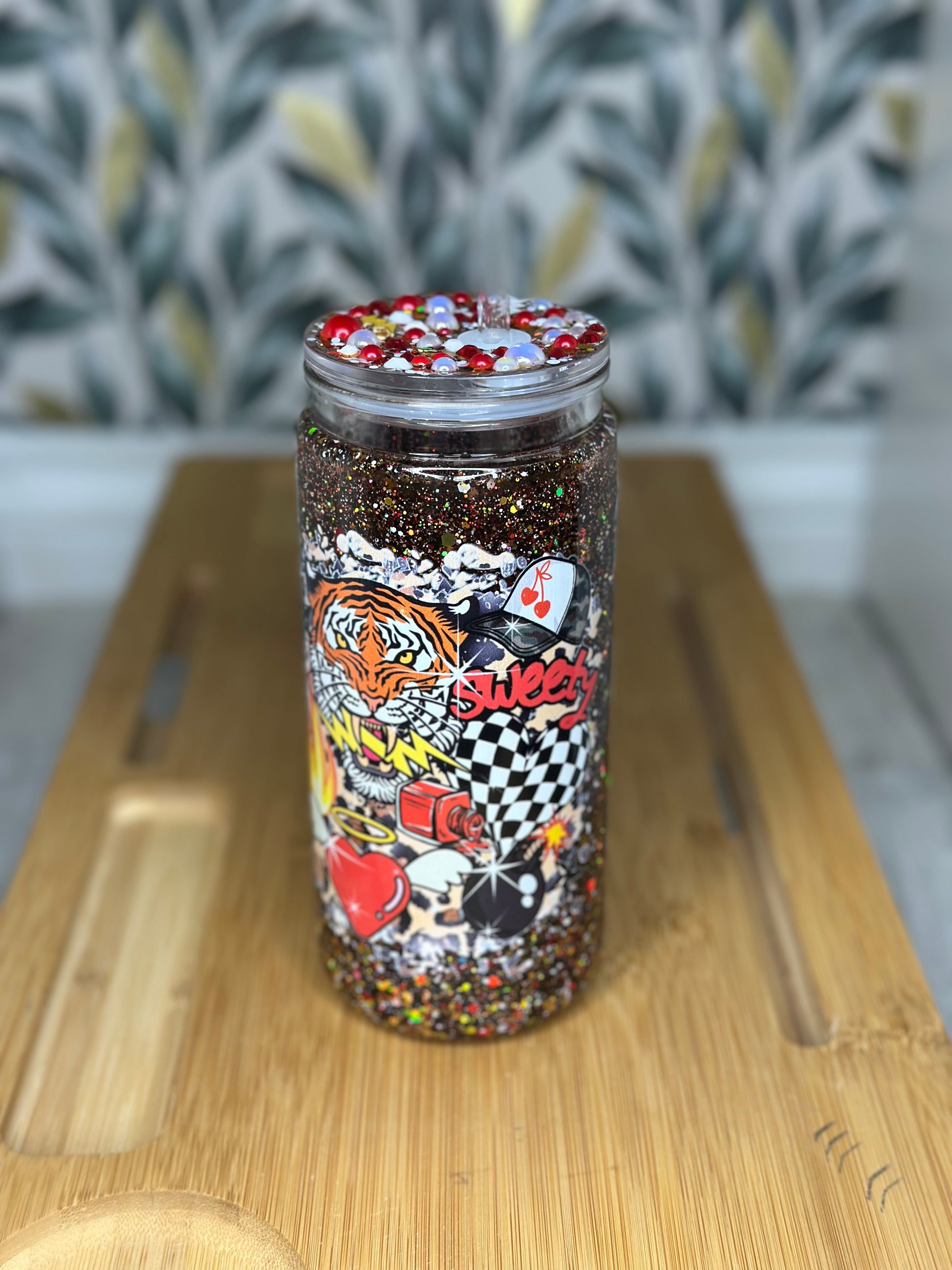This hand made glass can style cup is the perfect way to enjoy your favorite beverage. Crafted with a permanent UV DTF design , you'll have a modern and stylish companion for your coffee, tea, or cold drinks.